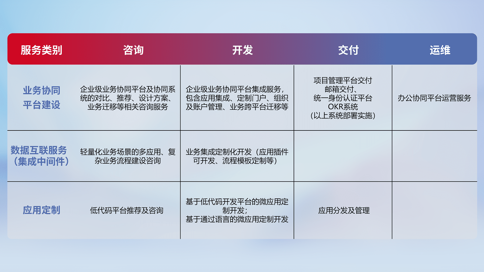 针对钉钉、、企微、、IDaas等平台级产品提供产品的规划、、、方案、、、、交付、、、、定制化开发等服务,,,实现如统一协同办公、、、、智能客户服务、、、混合会议管理、、、智能数据查询、、、、等业务场景,,实现数字化转型。。。。